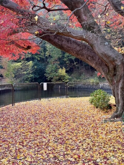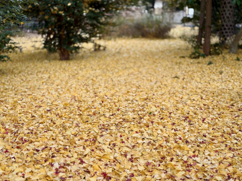 黄色くなった楓の葉っぱが地面一面を覆っています。