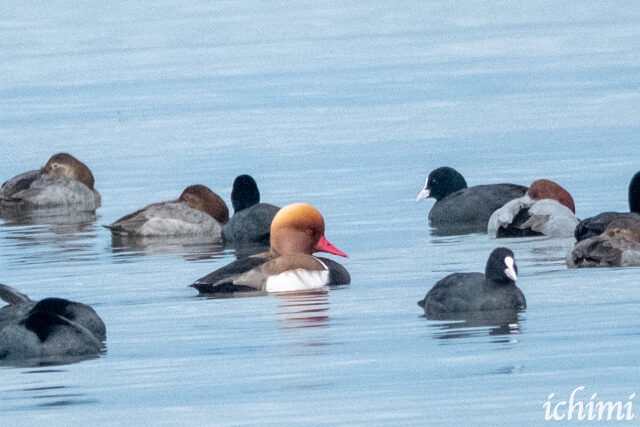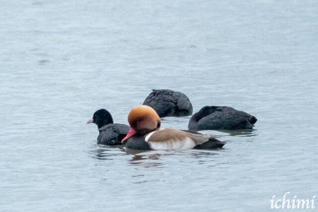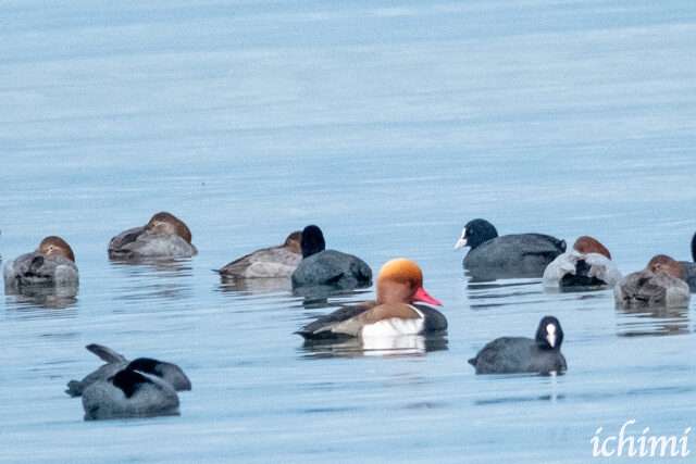 そして烏丸半島まで行きほとんど期待せず琵琶湖を双眼鏡で眺めているとアカハシハジロがいました。